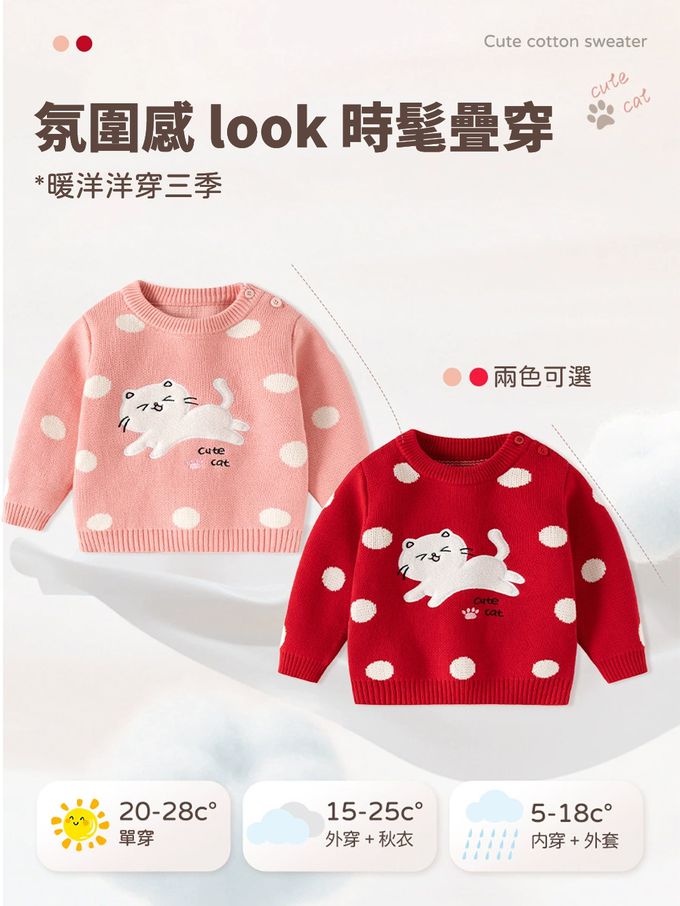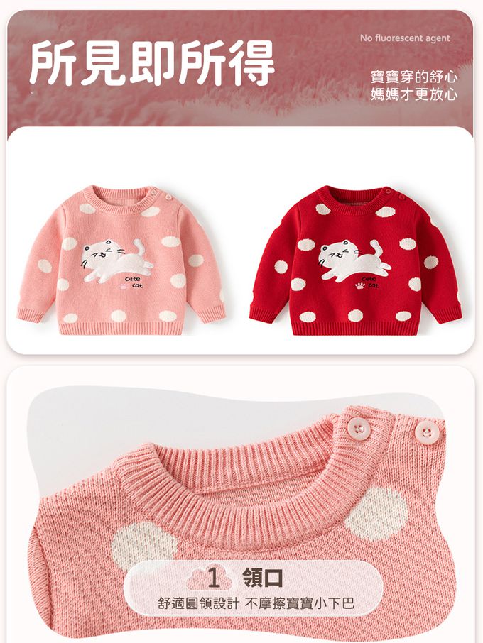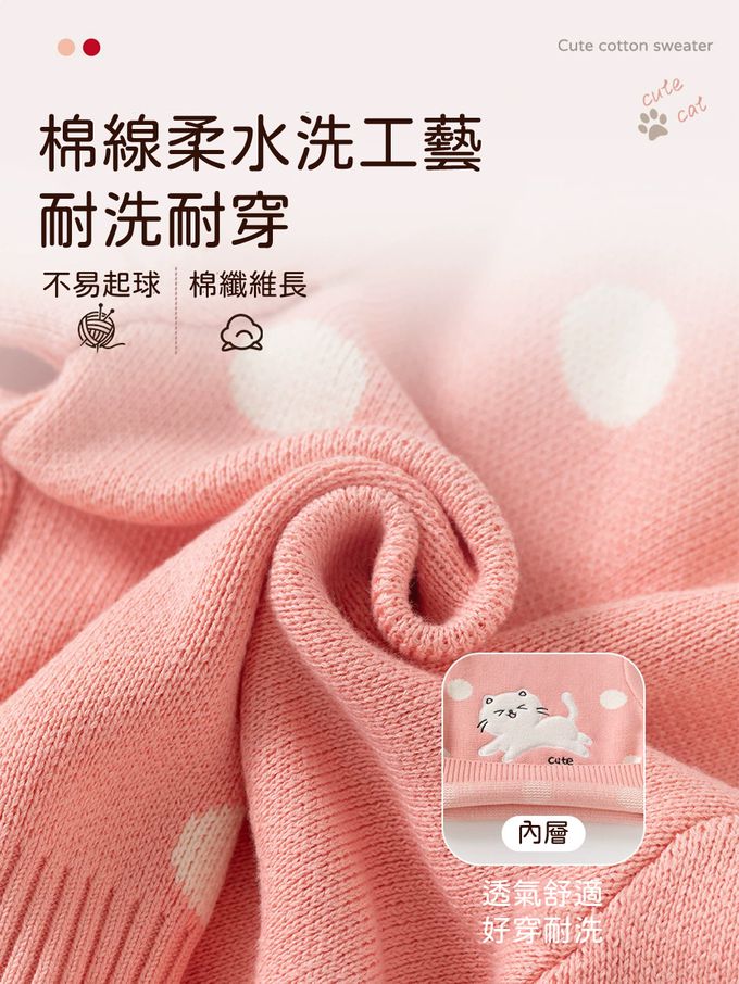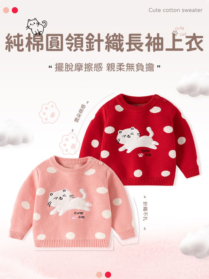 純棉圓領針織長袖上衣-可愛貓咪-粉色