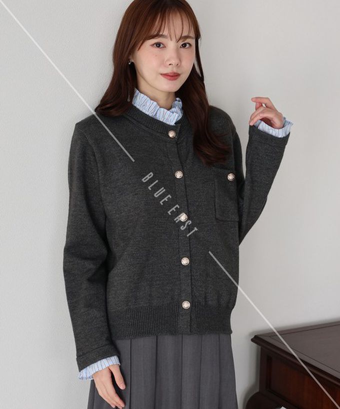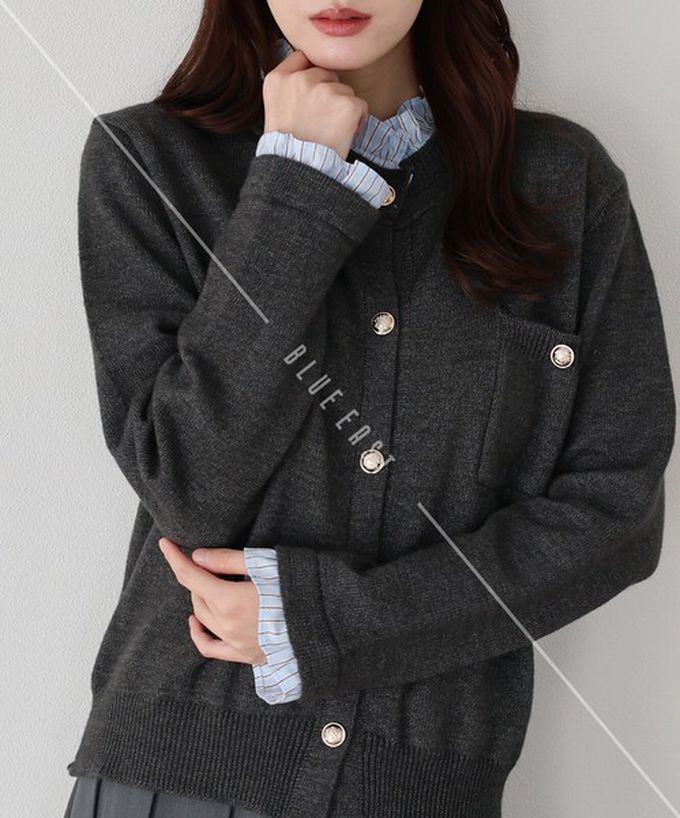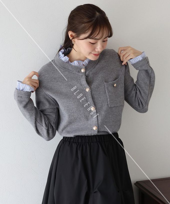 日本 BLUE EAST - 甜心假二件荷葉領金扣開襟衫-炭灰 (M)