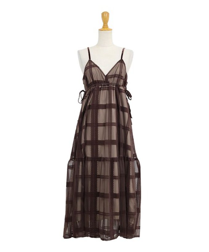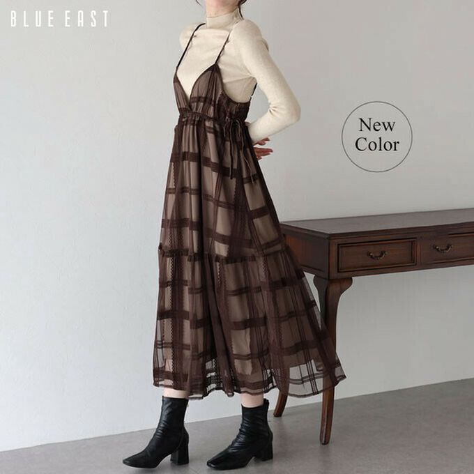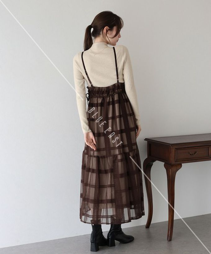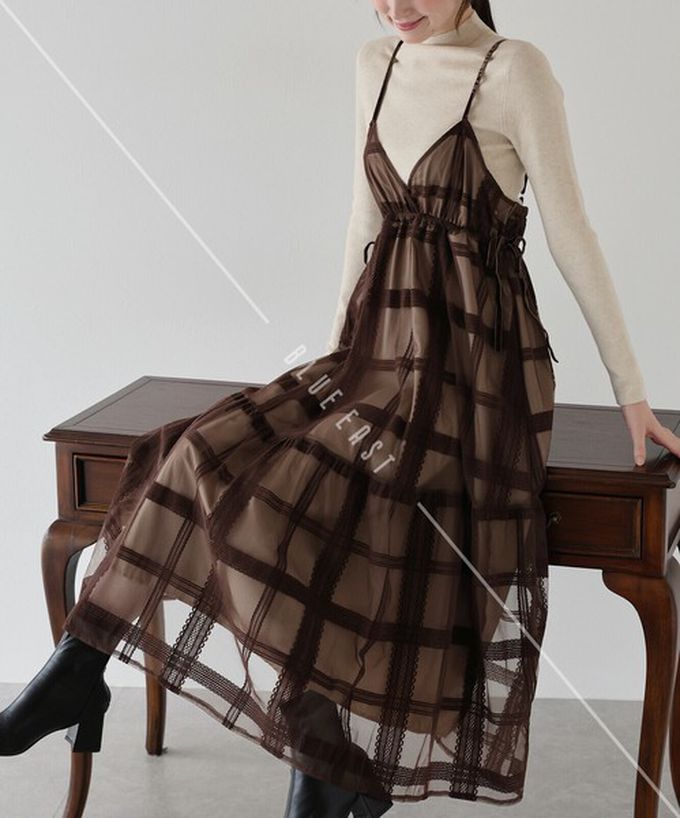 日本 BLUE EAST - 甜美植絨大格紋吊帶背心洋裝-咖啡