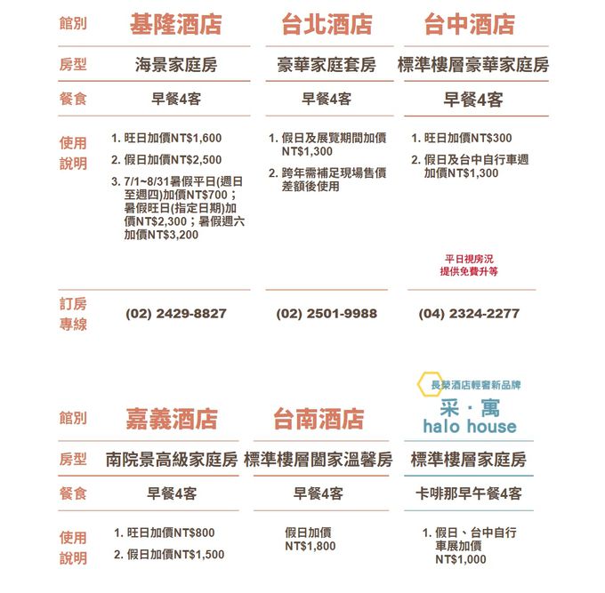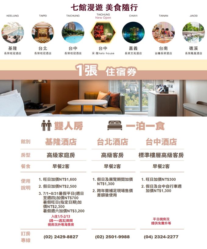 台中:1張享高級客房含2客早餐,2張享豪華家庭房含4客早餐,平日視房況升等,旺日加價300元,假日及展期加價1300元。