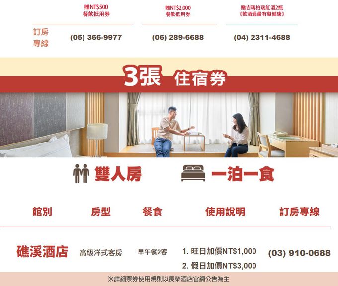 礁溪:3張享高級洋式客房含2客早午餐,旺日加價1000元,假日加價3000元。
