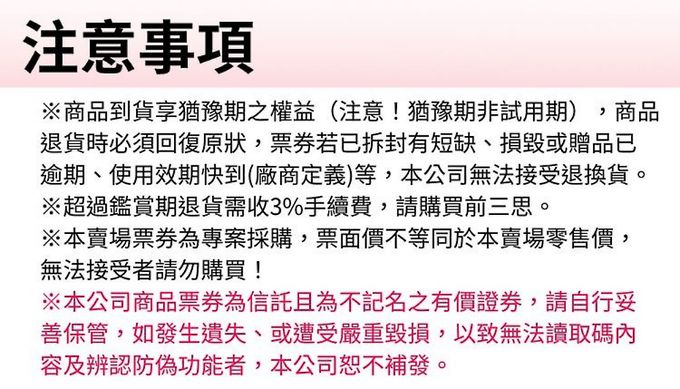 ★本公司商品票券皆信託且為不記名之有價證券,請自行妥善保管,如發生遺失、或遭受嚴重毀損,以致無法讀取條碼內容及辨認防偽功能者,本公司恕不補發
