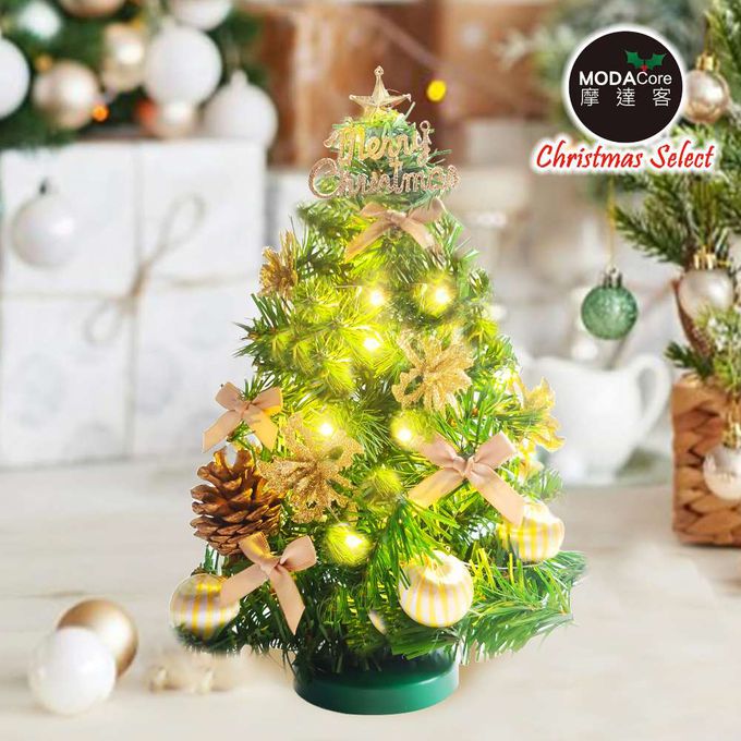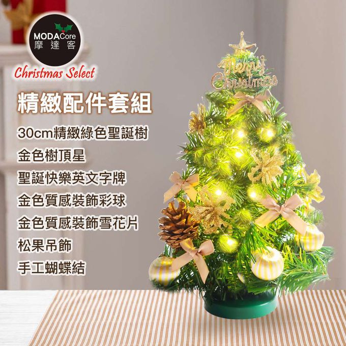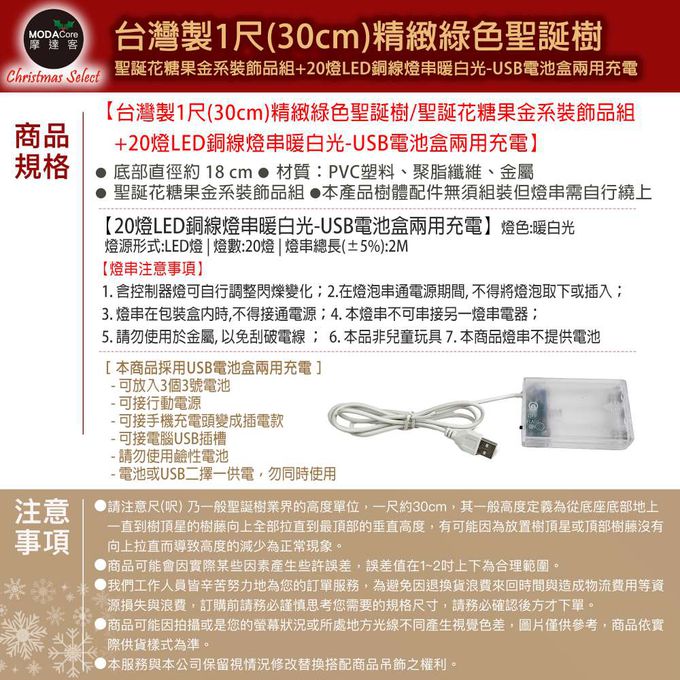 台灣製1尺30cm精緻綠色聖誕樹+聖誕花糖果金系裝飾品組_免組裝+20燈LED銅線燈串暖白光-USB電池盒兩用_本島免運費