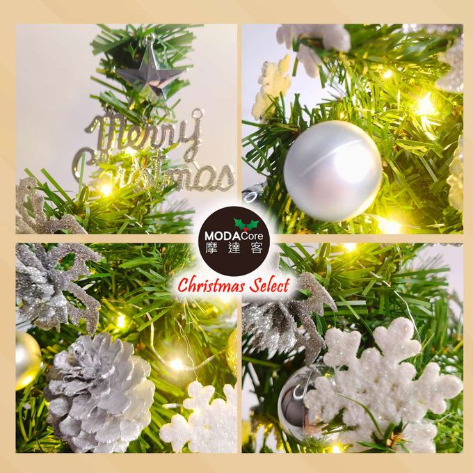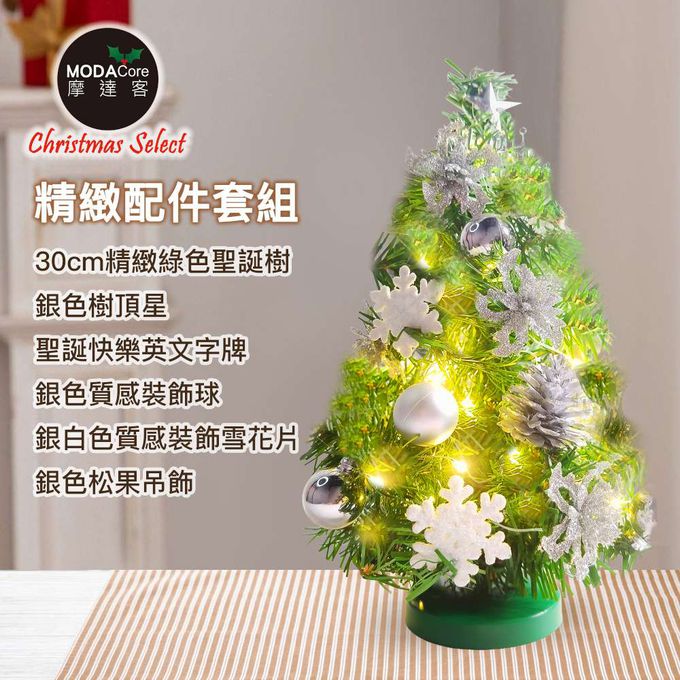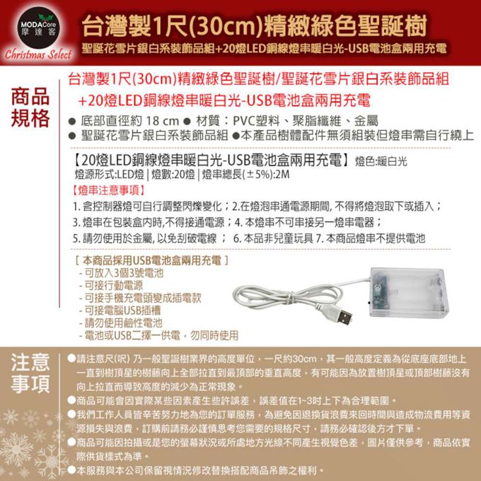 品名:台灣製1尺30cm精緻綠色聖誕+聖誕花雪片銀白系裝飾品組_免組裝+20燈LED銅線燈串暖白光-USB電池盒兩用_本島免運費