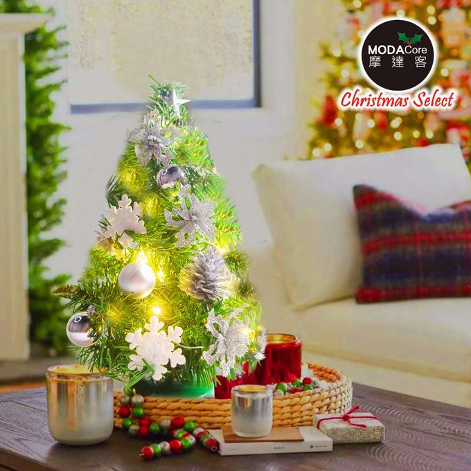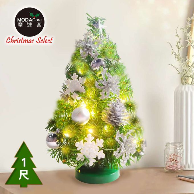 台灣製1尺30cm精緻綠色聖誕+聖誕花雪片銀白系裝飾品組_免組裝+20燈LED銅線燈串暖白光-USB電池盒兩用_本島免運費