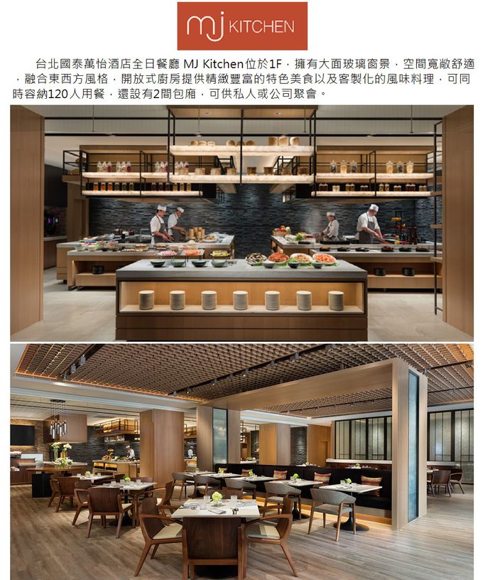 7.台北國泰萬怡酒店全日餐廳 MJ Kitchen 訂位電話:(02)7750-3337或透過線上訂位 餐廳地址:台北市中山區民生東路三段6號1樓