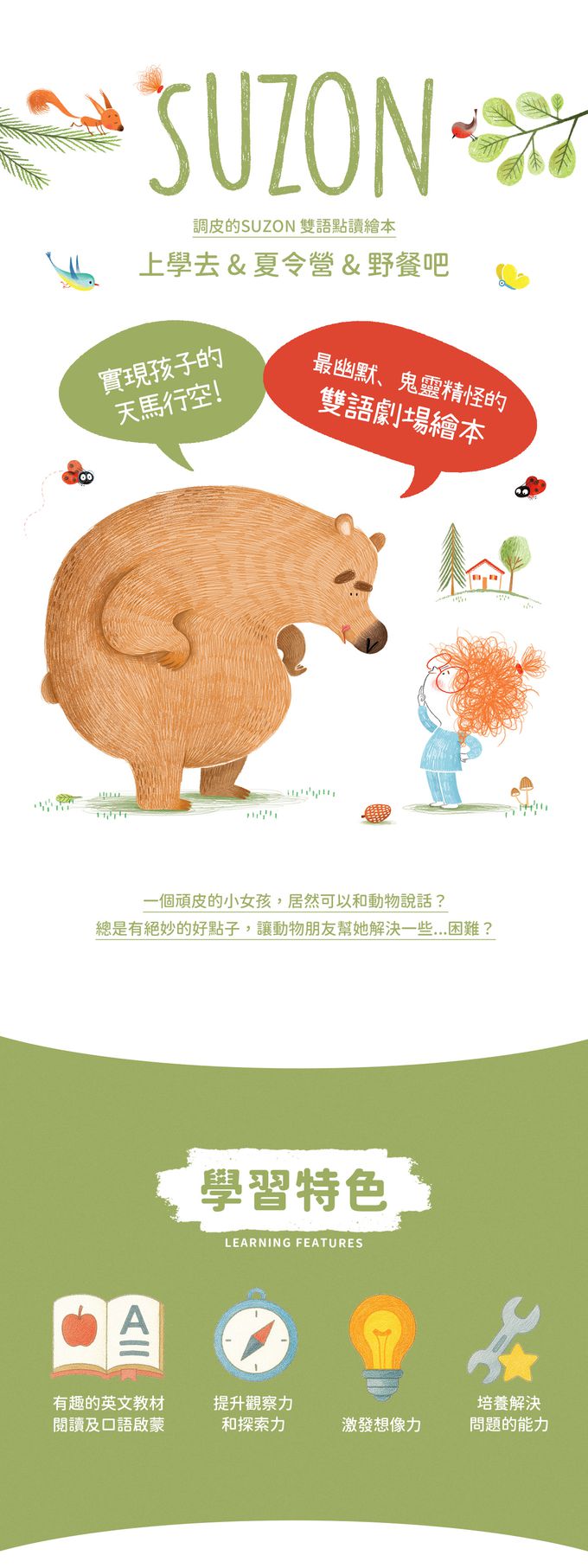 夏令營的第一天晚上,正當Suzon準備換上睡衣時,卻被朋友嘲笑她的可愛小熊內褲!難過的Suzon在小木屋外遇見了大熊,Suzon靈光一閃,或許她可以請大熊幫一點忙!