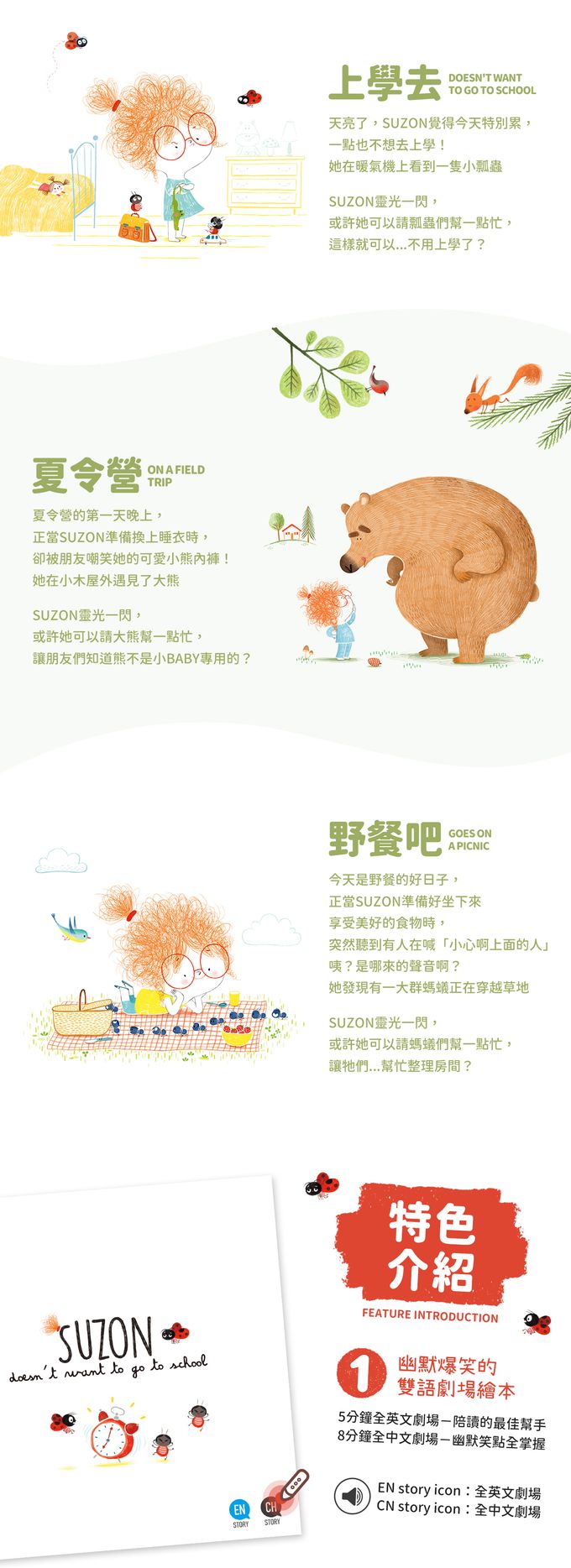 故事沒有要把她變成一個聽話的乖寶寶,而是真實呈現Suzon的小心思,用幽默和想像力收尾,讓問題變得沒那麼可怕~![]()