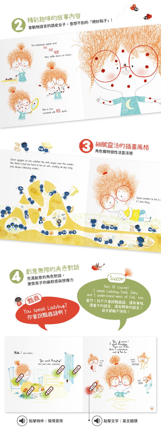 天亮了,Suzon覺得今天特別累,一點也不想去上學!他在暖氣機上看到一隻小瓢蟲。Suzon靈光一閃,或許她可以請瓢蟲們幫一點忙,這樣就可以⋯不用上學了?![]()