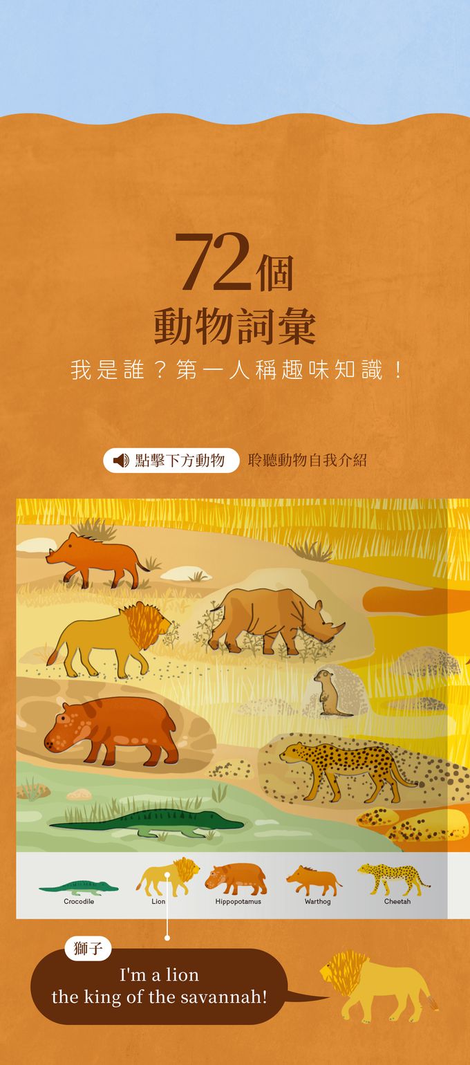 此書為全英文內容。沉浸式閱讀搭配72種動物詞彙,以第一人稱趣味自我介紹,讓知識更好記!