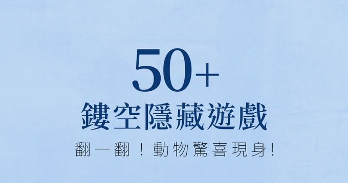 不僅如此全書共有50+鏤空隱藏遊戲,讓孩子翻一翻、摸一摸,發現動物驚喜!