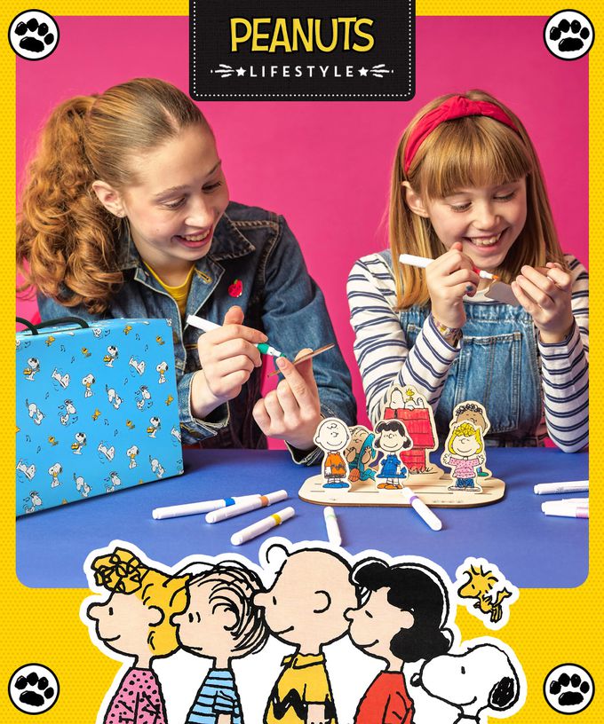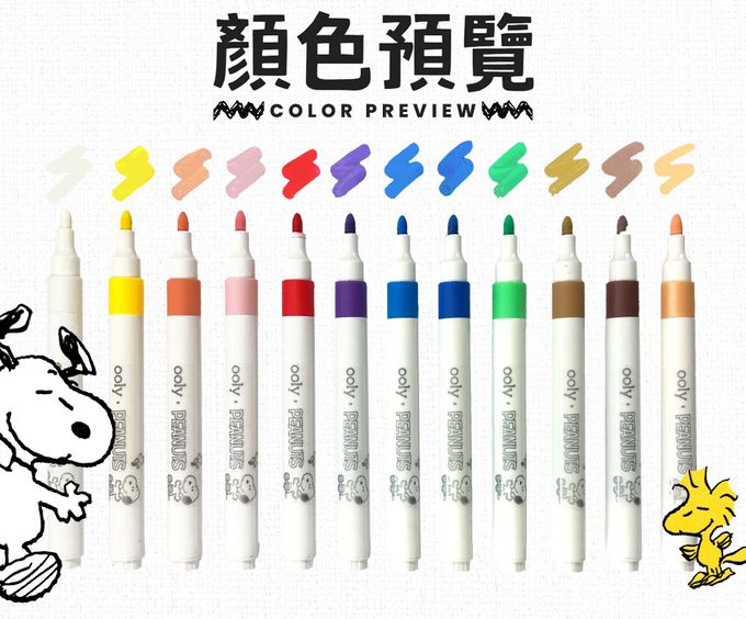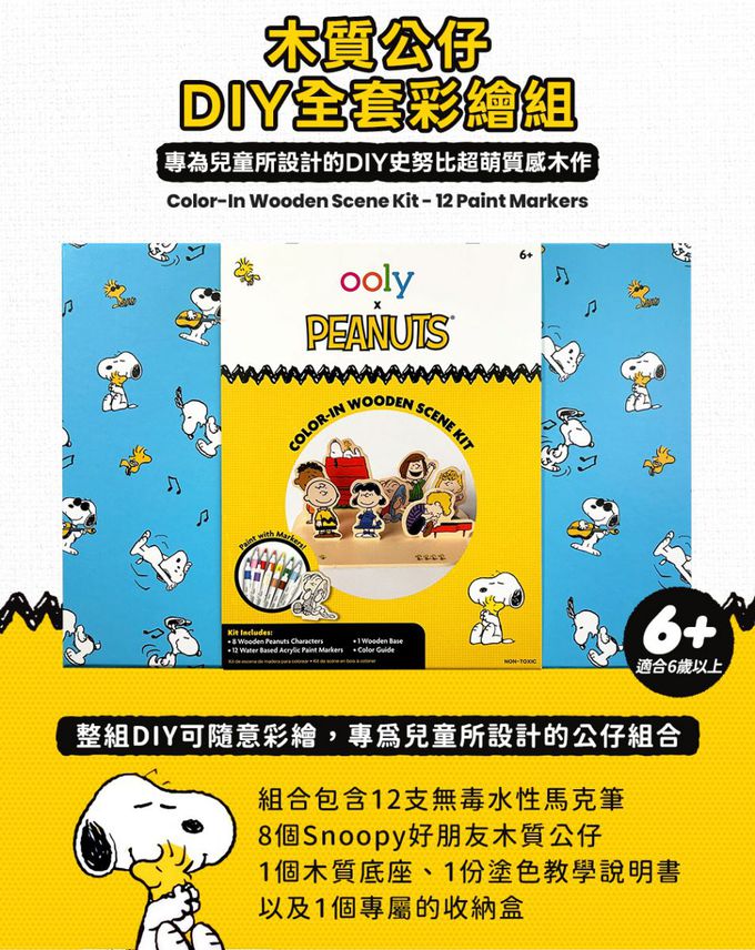 。整組包含12支無毒水性馬克筆, 8個Snoopy好朋友木質公仔, 1個木質底座,1份塗色教學說明書以及1個專屬的收納盒.