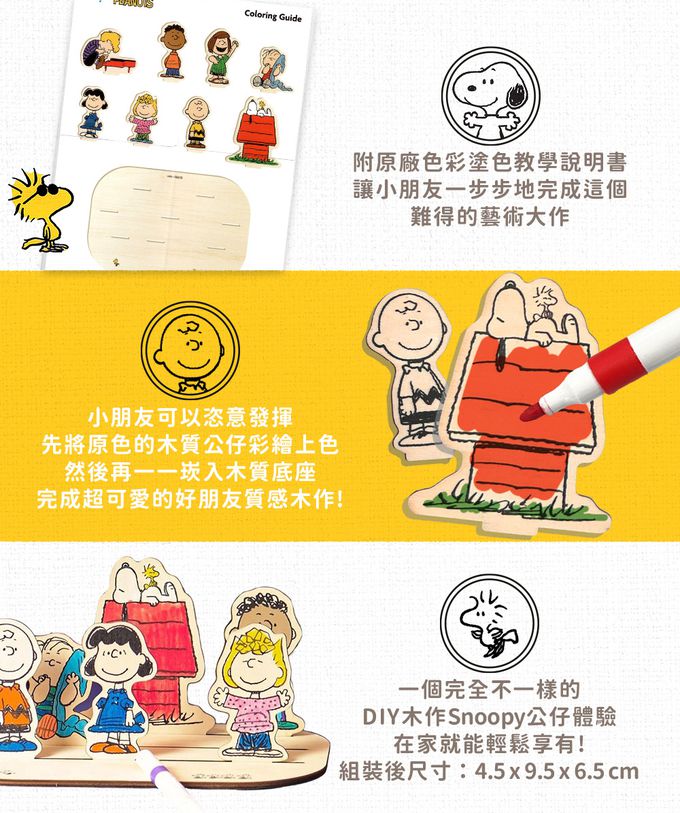 。小朋友可以恣意發揮, 先將原色的木質公仔彩繪上色, 然後再一一崁入木質底座, 完成超可愛的Snoopy的好朋友質感木作!