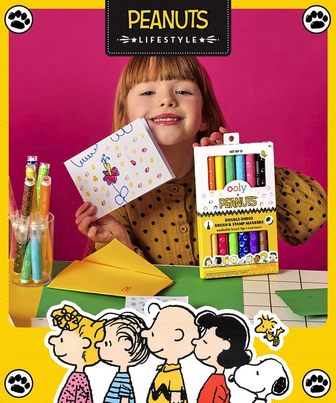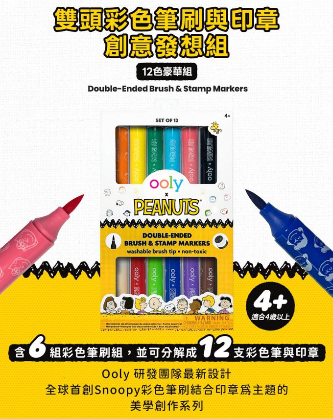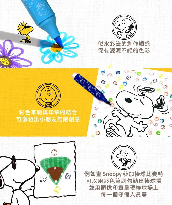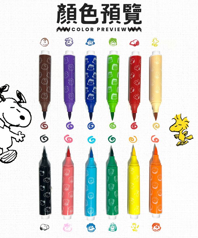 。整組包含6組彩色筆刷刷組合, 可分解成12支彩色筆刷, 並在另外一端可以蓋出12種專屬的Snoopy角色頭像印章.