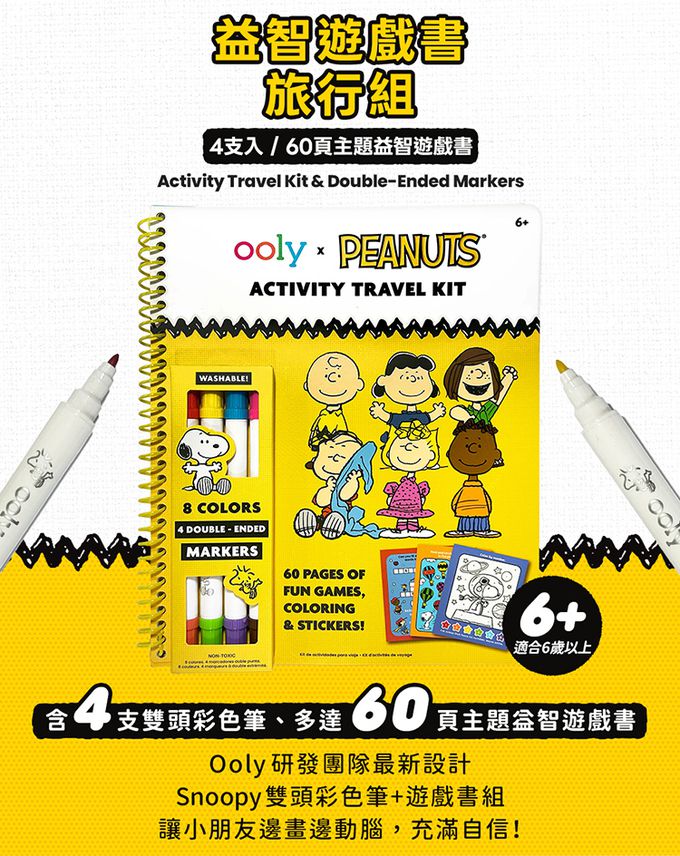 。整組包含4支雙頭彩色筆, 可呈現8種不同顏色, 及多達60頁的Snoopy主題益智遊戲書, 更加碼2頁可愛Snoopy貼紙.