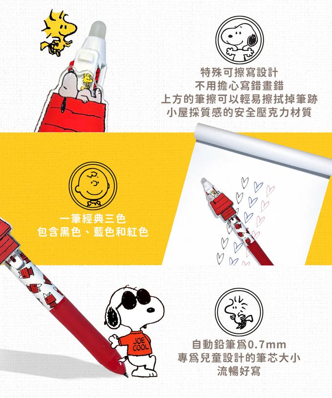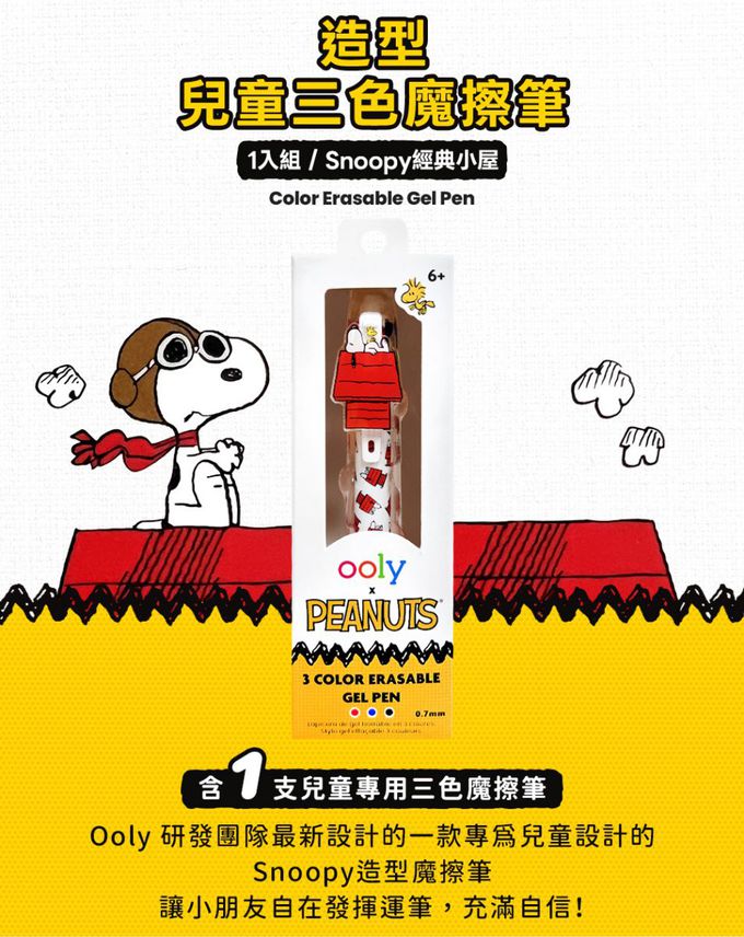 。Ooly 研發團隊最新設計的一款專為兒童設計的Snoopy造型魔擦筆,讓小朋友自在發揮運筆, 充滿自信!