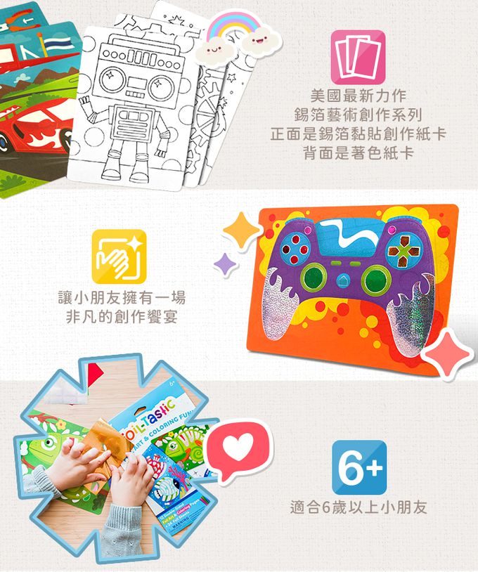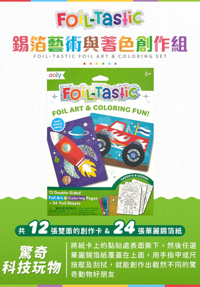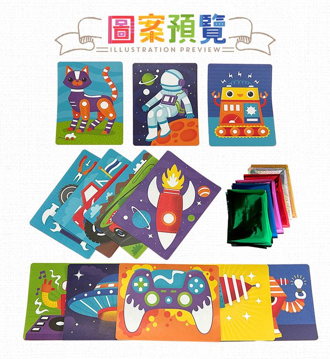 。美國最新力作錫箔藝術創作系列。整組包含12張雙面的創作卡,正面是錫箔黏貼創作紙卡,背面是著色紙卡,加上24張華麗錫箔紙。錫箔創作紙卡使用方式為: 將紙卡上的黏貼處表面撕下,然後任選華麗錫箔紙覆蓋在上面,用手指甲或尺按壓及刮拭,就能創作出截然不同的驚奇科技玩物。讓小朋友擁有一場非凡的創作饗宴。適合6歲以上小朋友 (6歲以下需在家長陪同指導下操作)