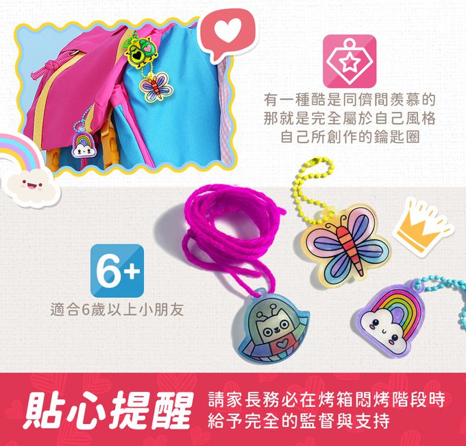 • 商品重(容)量:整組包含20種遇熱就會縮小的塑料小萌物,5個繽紛鑰匙環圈 (紅色、黃色、綠色、藍色和紫色),和3個繽紛線圈 (藍色、黃色和紅色) 。3個DIY步驟,超簡單! 上色、烘烤、製作