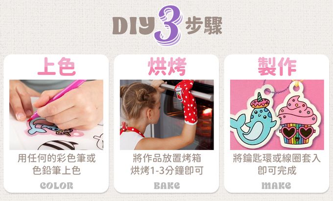 。小朋友用任何的彩色筆或色鉛筆上色,然後將作品放置烤箱1-3分鐘即可