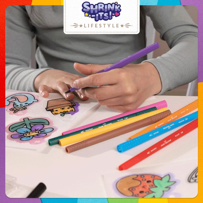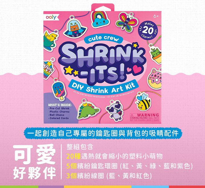 。整組包含20種遇熱就會縮小的塑料小萌物,5個繽紛鑰匙環圈 (紅色、黃色、綠色、藍色和紫色),和3個繽紛線圈 (藍色、黃色和紅色)