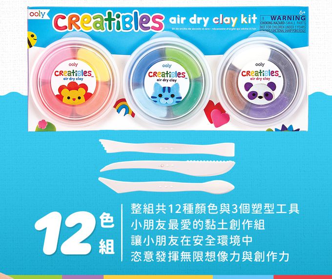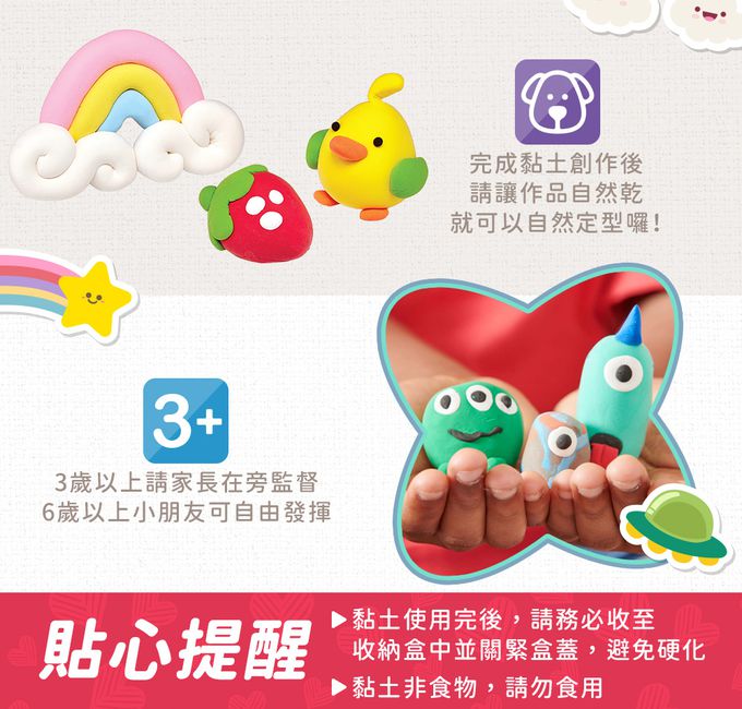 。小朋友最愛的黏土創作組, 讓小朋友在安全環境中, 恣意發揮無限想像力與創作力。風乾黏土,又輕又柔又乾淨,黏度適中,讓小朋友掌握度大幅提升。整組共12種顏色與3個塑型工具。12種顏色分別收納至3個分隔收納盒,請注意使用後務必要將盒蓋關緊。小朋友可以任意混搭顏色,創作出更多不同的精采顏色!。完成黏土創作後,請讓作品自然乾,就可以自然定型囉!。黏土非食物,請勿食用。3歲以上適用,請家長在旁監督。6歲以上小朋友可自由發揮