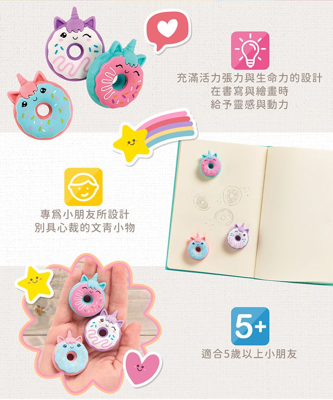 。Ooly創意團隊研發小物。整組包含3個原創的創意發想橡皮擦。充滿活力張力與生命力的設計。在書寫與繪畫時,給予靈感與動力。專為小朋友所設計,別具心裁的文青小物。適合5歲以上小朋友。請注意: 橡皮擦非食品,請勿食用