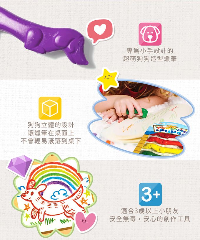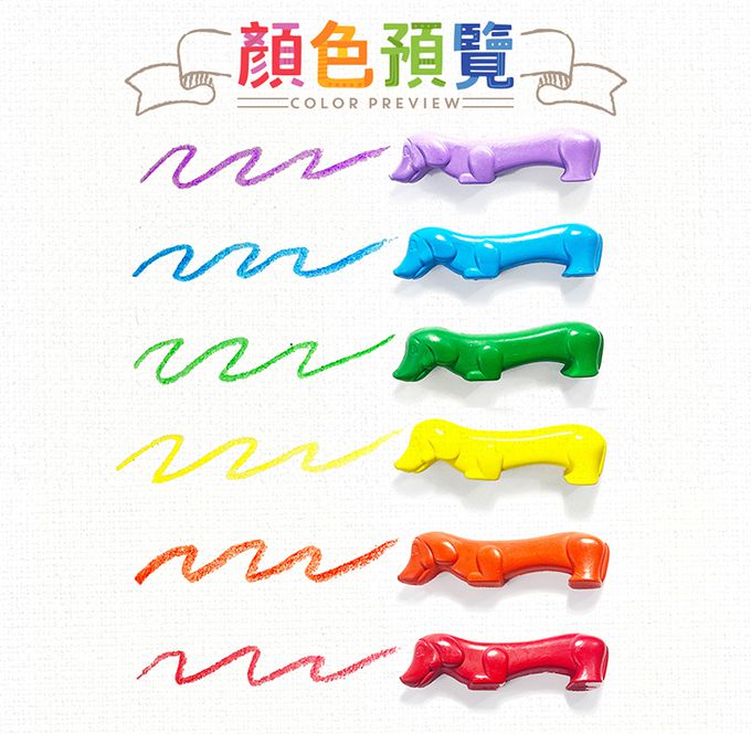 。專為小手設計的超萌狗狗造型蠟筆!。Ooly 研發團隊最新設計的一款專為小手抓握的狗狗造型蠟筆,讓創作又多添加了一番樂趣。小朋友在握筆上有了自信後, 才能盡情發揮創作!。狗狗立體的設計, 讓蠟筆在桌面上不會輕易滾落到桌下。安全無毒, 安心的創作工具。整組包含6支蠟筆。適合3歲以上小朋友