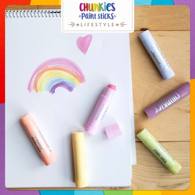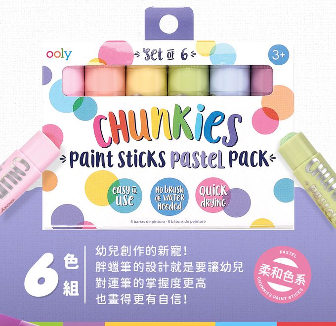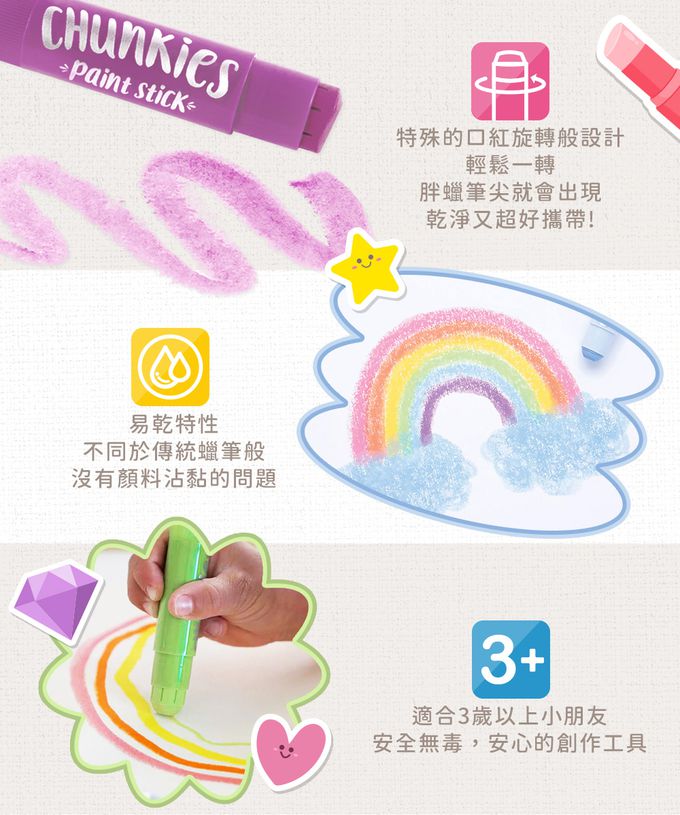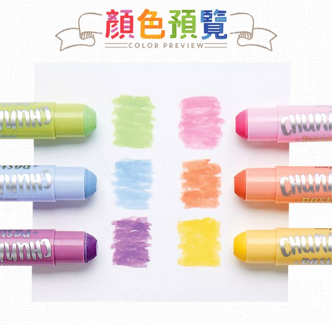 。幼兒創作的新寵 - 胖蠟筆。胖蠟筆的設計, 就是要讓幼兒對運筆的掌握度更高, 也畫得更有自信! 加上特殊的口紅旋轉般設計, 輕鬆一轉, 胖蠟筆尖就會出現, 既乾淨又超好攜帶!。易乾特性, 不會像傳統蠟筆般有沾黏的問題。一組6入, 含6種不同的淡色系柔和色彩。適合3歲以上小朋友