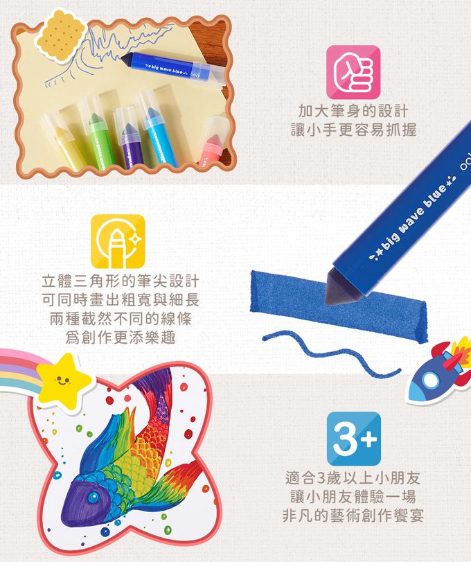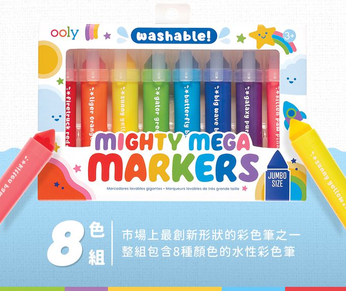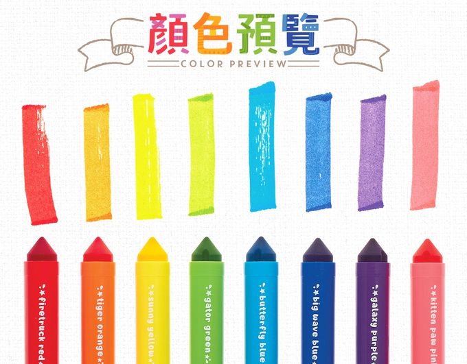 。市場上最創新形狀的彩色筆之一。整組包含8種顏色的水性彩色筆。加大筆身的設計, 讓小手更容易抓握。立體三角形的筆尖設計, 可以讓小朋友同時畫出粗寬與細長兩種截然不同的線條, 為幼兒創作更添樂趣。適合3歲以上小朋友。讓小朋友體驗一場非凡的藝術創作饗宴