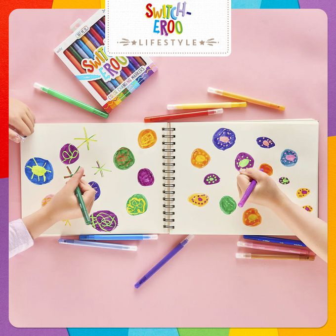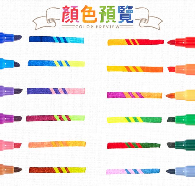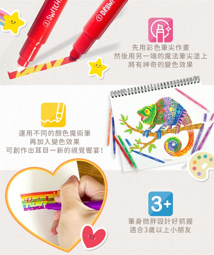 。幼兒創作界最新力作。全球專利設計, 筆的一端是彩色筆尖, 另一端則是魔法筆尖。先用彩色筆尖作畫, 然後用另一端的魔法筆尖塗上, 將有神奇的變色效果。運用不同的顏色魔術筆, 再加入變色效果, 可創作出耳目一新的視覺饗宴!。整組包含12支變色魔術筆。微胖設計好抓握。適合3歲以上小朋友