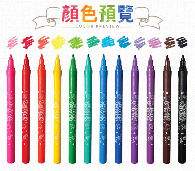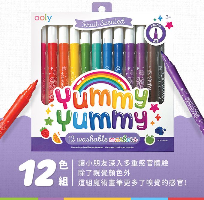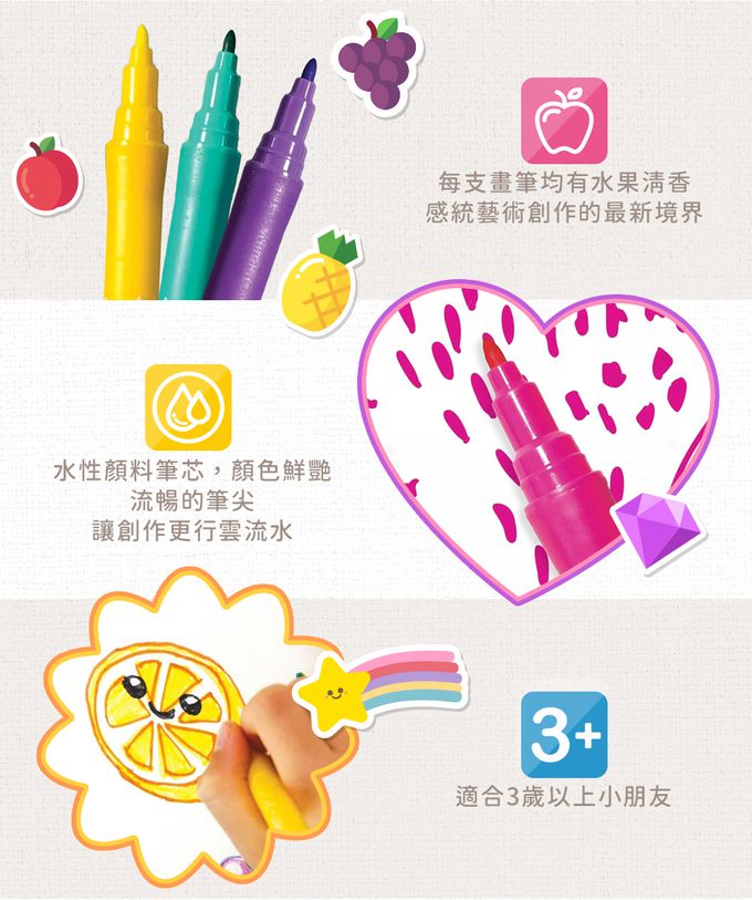 。讓小朋友深入多重感官體驗,除了視覺顏色外,這組魔術畫筆更多了嗅覺的感官!。均有水果清香,感統藝術創作的最新境界。一組有12個顏色,擁有作畫流暢的筆尖。水性顏料筆芯,顏色鮮艷,讓創作更行雲流水。適合3歲以上小朋友