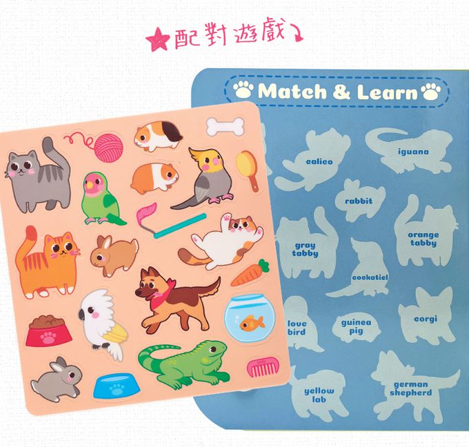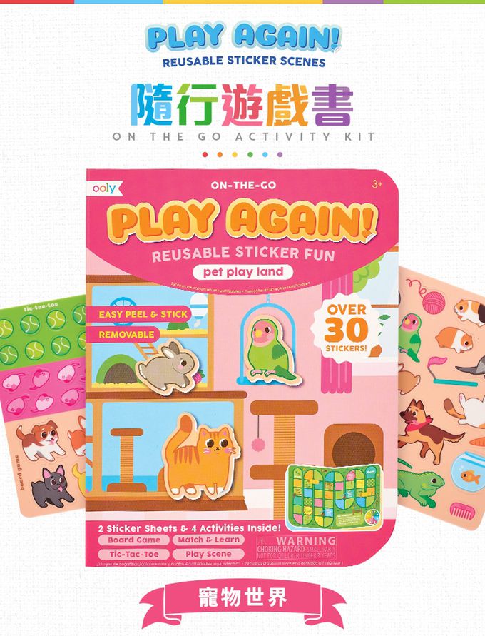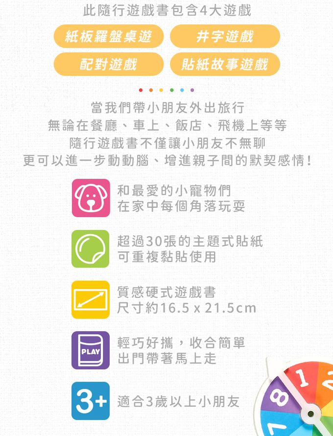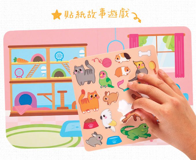 。當我們帶小朋友外出旅行,無論在餐廳、車上、飯店、飛機上等等,隨行遊戲書不僅讓小朋友不無聊,更可以進一步動動腦、增進親子間的默契感情!。此隨行遊戲書包含4大遊戲,分別為:紙板羅盤桌遊、井字遊戲、配對遊戲以及貼紙故事遊戲。和最愛的小寵物們在家中每個角落玩耍。質感硬式遊戲書, 尺寸約 16.5 x 21.5 cm。超過30張的主題式貼紙, 可重複使用。輕巧好攜帶, 收合超簡單, 出門帶著馬上走。適合3歲以上小朋友