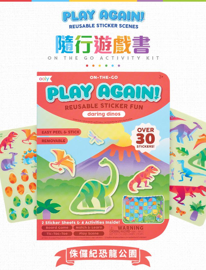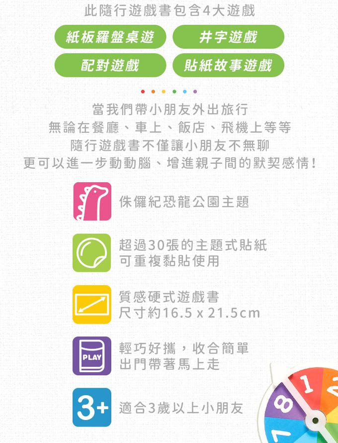 。當我們帶小朋友外出旅行,無論在餐廳、車上、飯店、飛機上等等,隨行遊戲書不僅讓小朋友不無聊,更可以進一步動動腦、增進親子間的默契感情!。此隨行遊戲書包含4大遊戲,分別為:紙板羅盤桌遊、井字遊戲、配對遊戲以及貼紙故事遊戲。侏儸紀恐龍公園主題。質感硬式遊戲書, 尺寸約 16.5 x 21.5 cm。超過30張的主題式貼紙, 可重複使用。輕巧好攜帶, 收合超簡單, 出門帶著馬上走。適合3歲以上小朋友