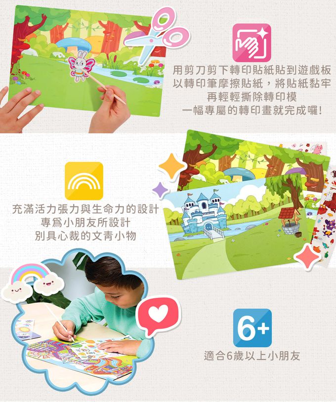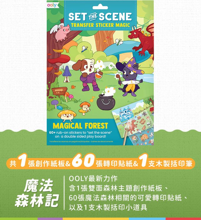。Ooly最新力作,專為小朋友所設計的轉印貼紙創作組。內含1張雙面海洋主題創作紙板、60張魔法森林相關的可愛轉印貼紙以及1支木製括印小道具。充滿活力張力與生命力的設計。專為小朋友所設計,別具心裁的文青小物。適合6歲以上小朋友