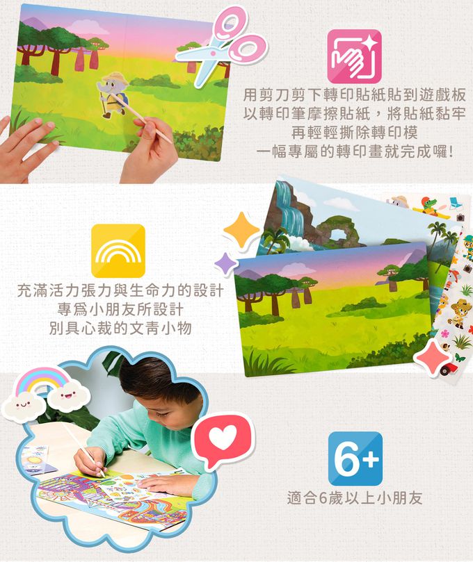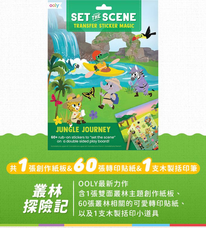 。Ooly最新力作,專為小朋友所設計的轉印貼紙創作組。內含1張雙面叢林主題創作紙板、60張叢林相關的可愛轉印貼紙以及1支木製括印小道具。充滿活力張力與生命力的設計。專為小朋友所設計,別具心裁的文青小物。適合6歲以上小朋友