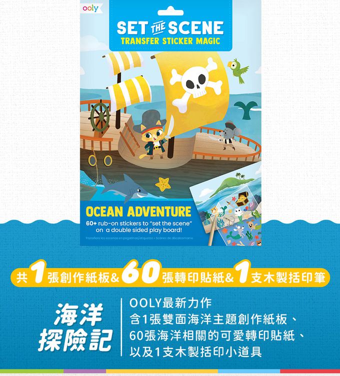 。Ooly最新力作,專為小朋友所設計的轉印貼紙創作組。內含1張雙面海洋主題創作紙板、60張海洋相關的可愛轉印貼紙以及1支木製括印小道具。充滿活力張力與生命力的設計。專為小朋友所設計,別具心裁的文青小物。適合6歲以上小朋友