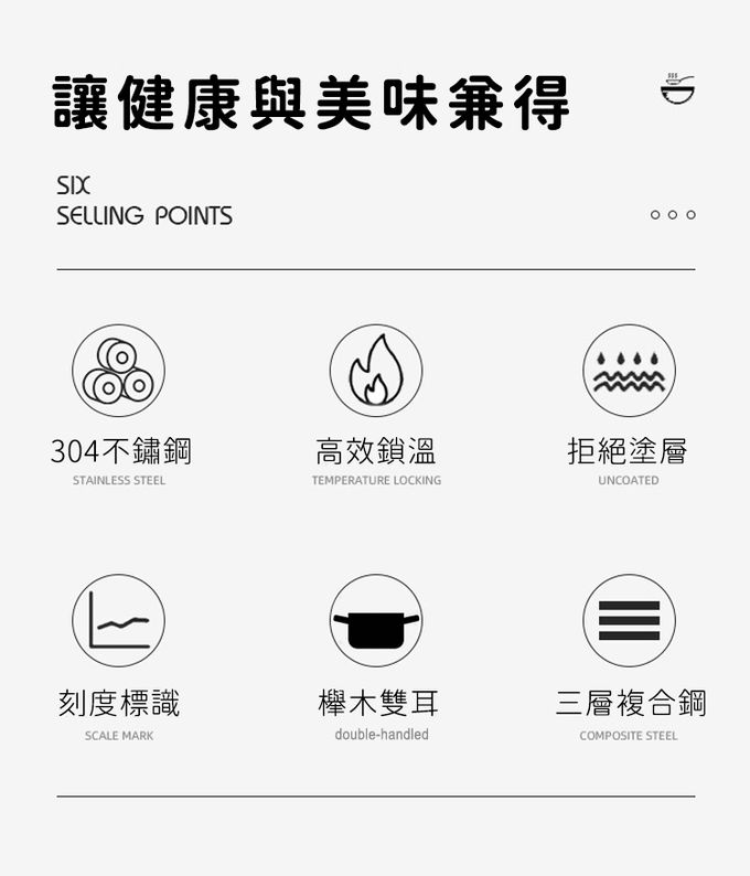注意事項:1.商品到貨享鑑賞期之權益,鑑賞期並非試用期,辦理退貨商品必須是全新狀態且紙箱及商品配件包裝須完整。商品一經使用或組裝後,恕無法辦理退換貨。 2.商品為人工丈量略有1~3公分內誤差,請以實品為主。 3.網頁商品會因面板螢幕解析度不同,造成圖片顏色呈現略有不同,請以實品顏色為準 4.商品圖為情境示意圖,本商品內容不包含擺飾物品。 5.使用前用中性清潔劑及清水清洗即可。 6.請放置於通風乾燥處,遠離過於潮濕地方 7. 請勿使用於微波爐。 8.商品為全不鏽鋼製,加熱時請小心,需用防燙手套,避免燙傷。 9.避免產品長時間沾染鹽分和酸性污垢,避開水氣濕重的地方保管。.請不用於長時間存放食物,不要驟冷驟熱交替使用 10.為了防止燙傷,請不要裝太滿 11.請調節好火力,避免火焰從底部冒出。 12.燒水後出現彩虹紋或小斑點是正常水漬和不鏽鋼反射的顏色 13.請不要用鋼絲球等清洗鍋子內部 14.不鏽鋼製品可能在生產或包裝過程中,底部可能會產生些許的劃痕不影響整體美觀及使用 15.請勿空燒。