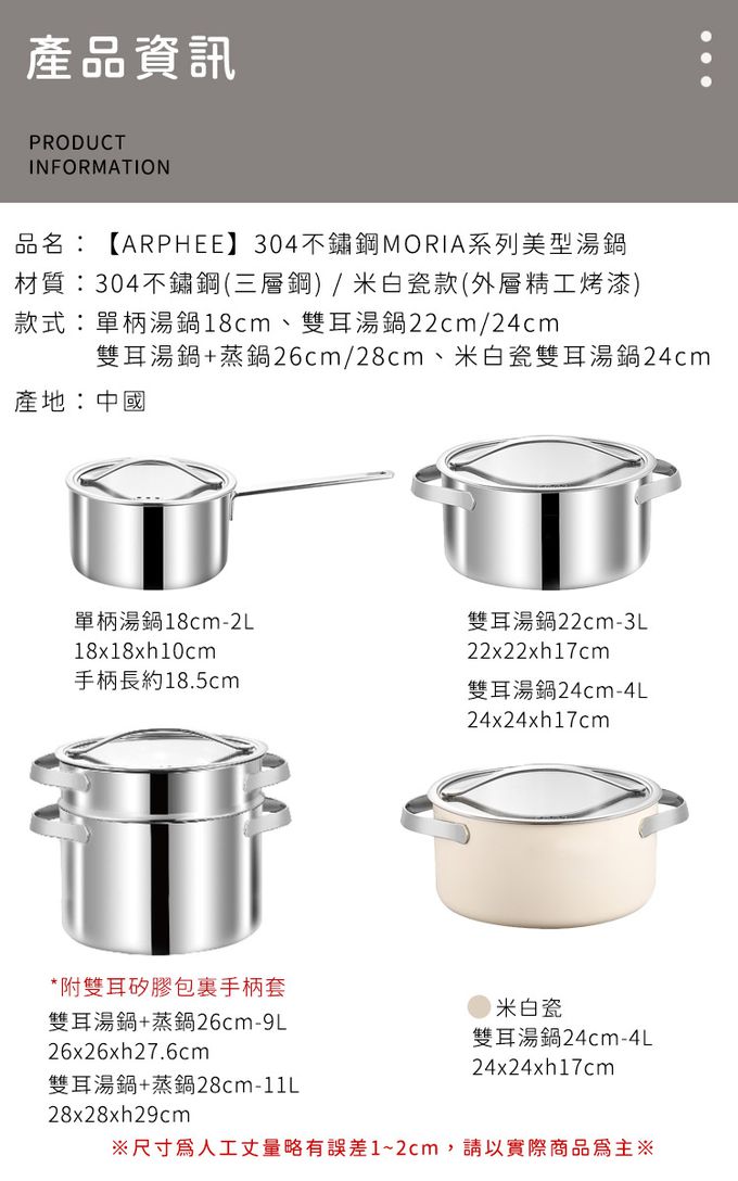 注意事項:1.商品到貨享鑑賞期之權益,鑑賞期並非試用期,辦理退貨商品必須是全新狀態且紙箱及商品配件包裝須完整。商品一經使用或組裝後,恕無法辦理退換貨。 2.商品為人工丈量略有1~3公分內誤差,請以實品為主。 3.網頁商品會因面板螢幕解析度不同,造成圖片顏色呈現略有不同,請以實品顏色為準 4.商品圖為情境示意圖,本商品內容不包含擺飾物品。 5.使用前用中性清潔劑及清水清洗即可。 6.請放置於通風乾燥處,遠離過於潮濕地方 7. 請勿使用於微波爐。 8.商品為全不鏽鋼製,加熱時請小心,需用防燙手套,避免燙傷。 9.避免產品長時間沾染鹽分和酸性污垢,避開水氣濕重的地方保管。.請不用於長時間存放食物,不要驟冷驟熱交替使用 10.為了防止燙傷,請不要裝太滿 11.請調節好火力,避免火焰從底部冒出。 12.燒水後出現彩虹紋或小斑點是正常水漬和不鏽鋼反射的顏色 13.請不要用鋼絲球等清洗鍋子內部 14.不鏽鋼製品可能在生產或包裝過程中,底部可能會產生些許的劃痕不影響整體美觀及使用 15.請勿空燒。
