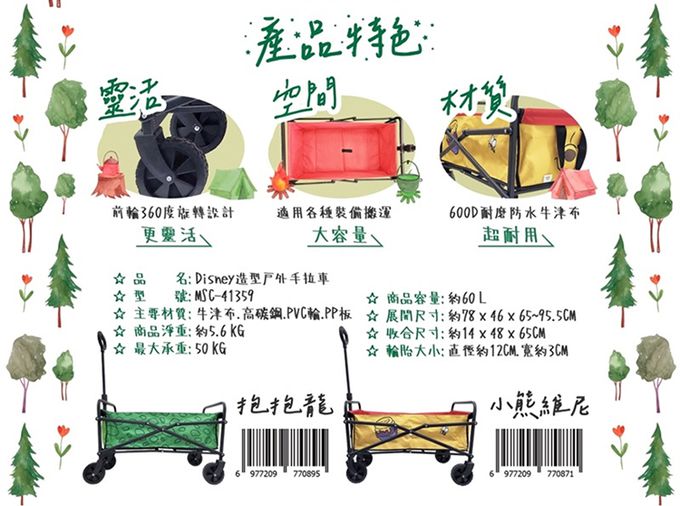 注意事項:主要材質:牛津布、高碳鋼、PVC輪、PP板 商品容量:約 60L 展開尺寸:約 78x46x65~95.5cm 收和尺寸:約 14x48x65cm 輪胎大小:直徑 約 12cm、寬 約 3cm 商品淨重:約 5.6kg 最大承重:50kg 產地:中國 【注意事項】 ● 本產品不能乘載兒童。 ● 請小心小零件,避免窒息的危險。 ● 兒童使用本產品時,需有成人在旁監護。 ● 使用時,不容許用自行車、汽車或者其他車拖行。 ● 使用前,請完整閱讀使用說明書,必需由成人組裝。 ● 不允許任意修改,修改後可能會減低產品的安全性造成危險。 ● 定期檢查螺絲是否鬆動及零件損壞,如有必要,請更換受損零件。 ● 禁止於公共及一般道路使用,請在空曠平坦、安全、遠離交通道路的地方使用。 ● 此塑膠袋不是玩具,為避免嬰兒或兒童產生窒息之危險,請於拆卸後立即將此塑膠袋銷毀或遠離嬰兒及兒童。