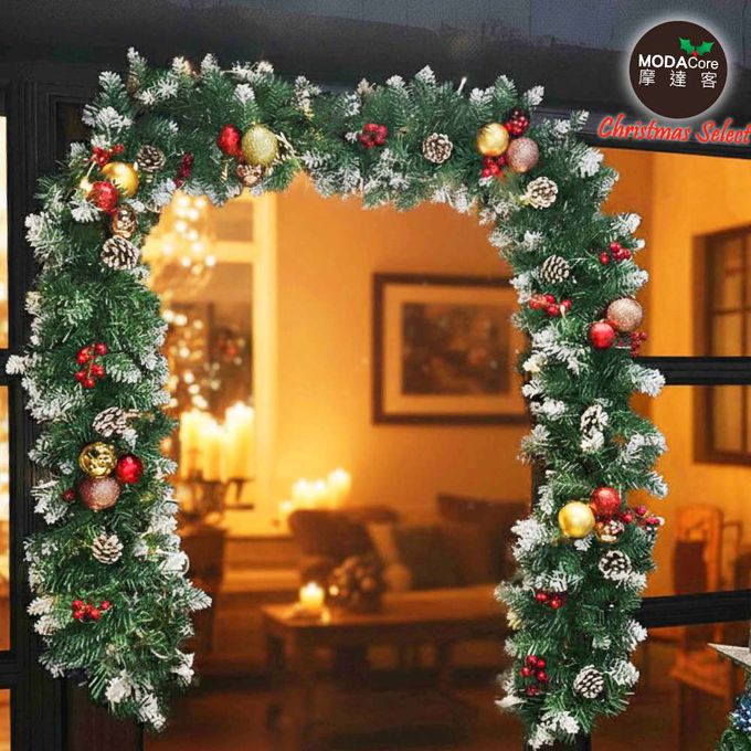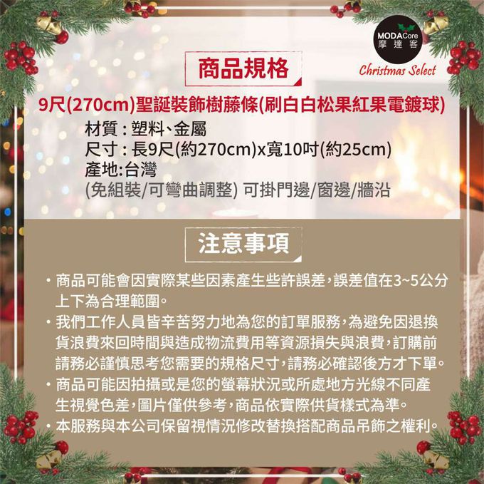 品名:9尺/270cm刷白松果紅果裝飾樹藤條+優雅紅繽金電鍍球裝飾-免組裝/可彎曲調整_可掛門邊/窗邊/牆沿_本島免運費