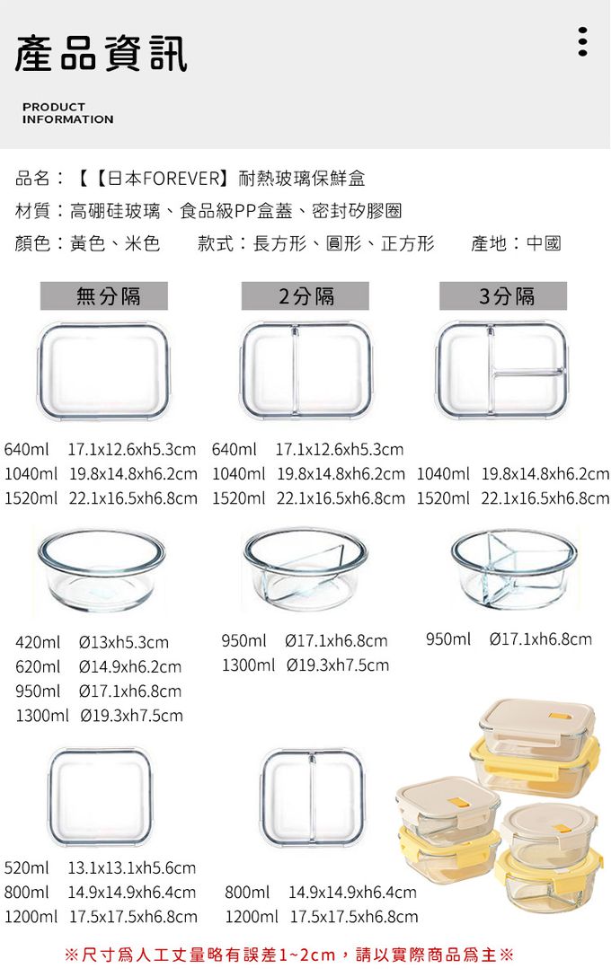 【日本 FOREVER 耐熱玻璃保鮮盒系列】以耐熱玻璃材質搭配簡潔透明盒身,能清楚辨識內容物,日常取用更便利。盒身適合一般冷藏與加熱需求,上蓋密合度佳,可整齊堆疊保存。提供長方形、正方形與圓形多款組合,涵蓋小容量到大容量,可依餐量、備餐計畫與家庭使用情境彈性挑選,是居家保存食物與分裝料理的實用選擇。