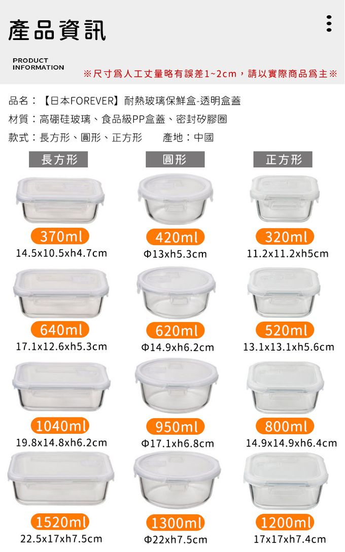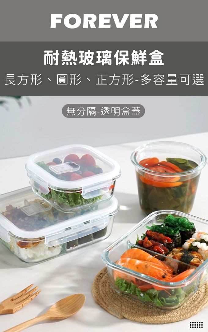 【日本 FOREVER 耐熱玻璃保鮮盒系列】以耐熱玻璃材質搭配簡潔透明盒身,能清楚辨識內容物,日常取用更便利。盒身適合一般冷藏與加熱需求,上蓋密合度佳,可整齊堆疊保存。提供長方形、正方形與圓形多款組合,涵蓋小容量到大容量,可依餐量、備餐計畫與家庭使用情境彈性挑選,是居家保存食物與分裝料理的實用選擇。