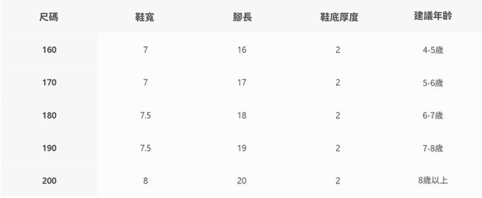 2. 每個尺寸的建議年齡、建議身高僅供參考,每位孩子發育狀況各有不同,建議參考寶貝現有的鞋子尺寸做對照。