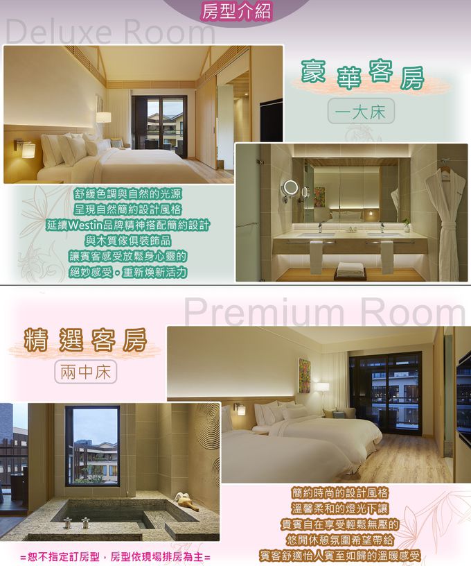 1.本券可於宜蘭力麗威斯汀度假酒店入住豪華客房或精選客房住宿乙晚,優惠內容可擇一使用。※房型依現場排房為準,恕不得指定。