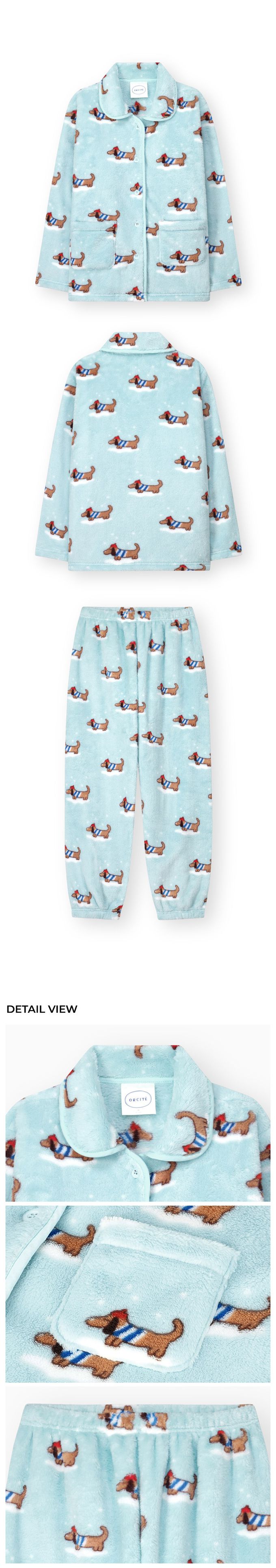 韓國 Orcite - (媽媽)蓬鬆柔軟天鵝絨保暖長袖睡衣套裝-狗狗-天藍