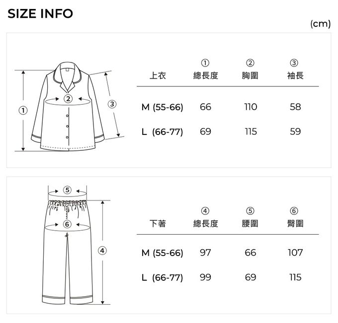 1. 尺寸表單位皆為公分(cm),實際尺寸會因布料彈性、水洗、測量起迄點等因素略有誤差。