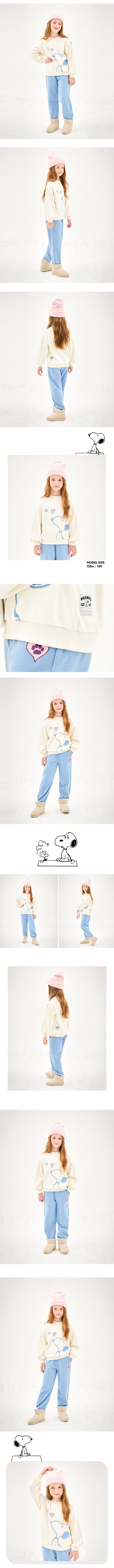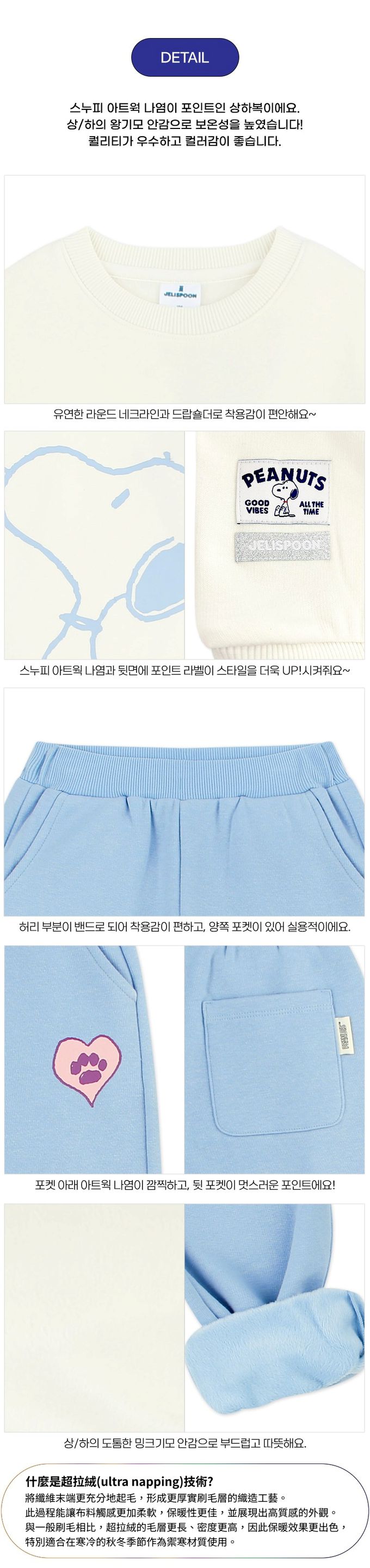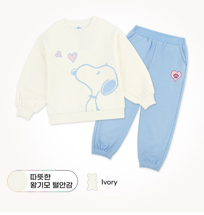 韓國 Jelispoon - (聯名款)愛心卡通人物史努比內刷毛長袖套裝-米白X天藍