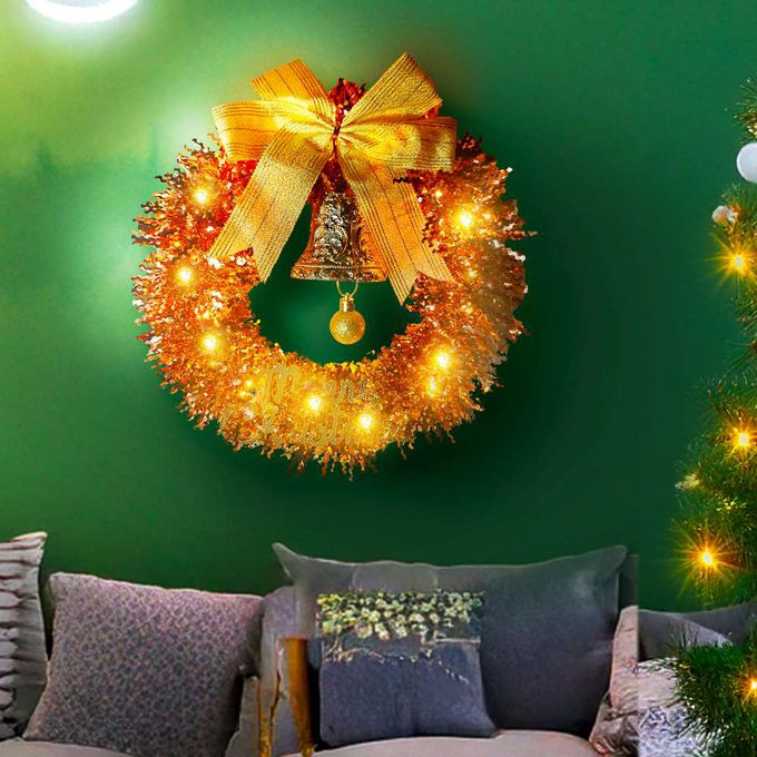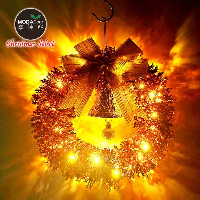 品名:11吋優雅香檳玫金系金蔥彎絲聖誕花圈+20燈LED暖白光燈串_本島免運費