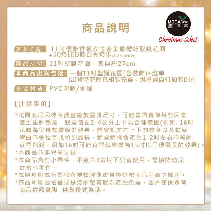 11吋優雅香檳玫金系金蔥彎絲聖誕花圈+20燈LED暖白光燈串_本島免運費