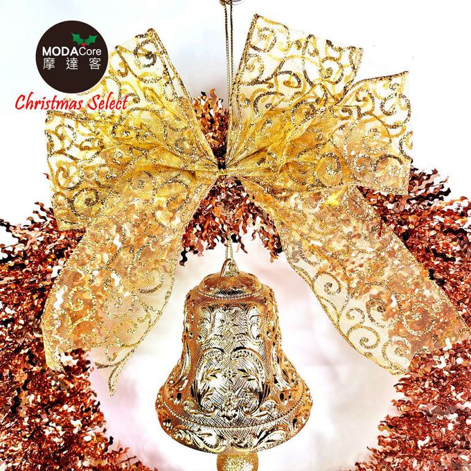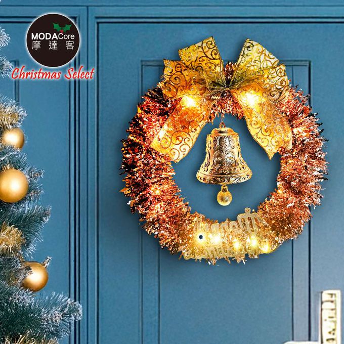 品名:14吋優雅香檳玫金系金蔥彎絲聖誕花圈+20燈LED暖白光燈串_本島免運費